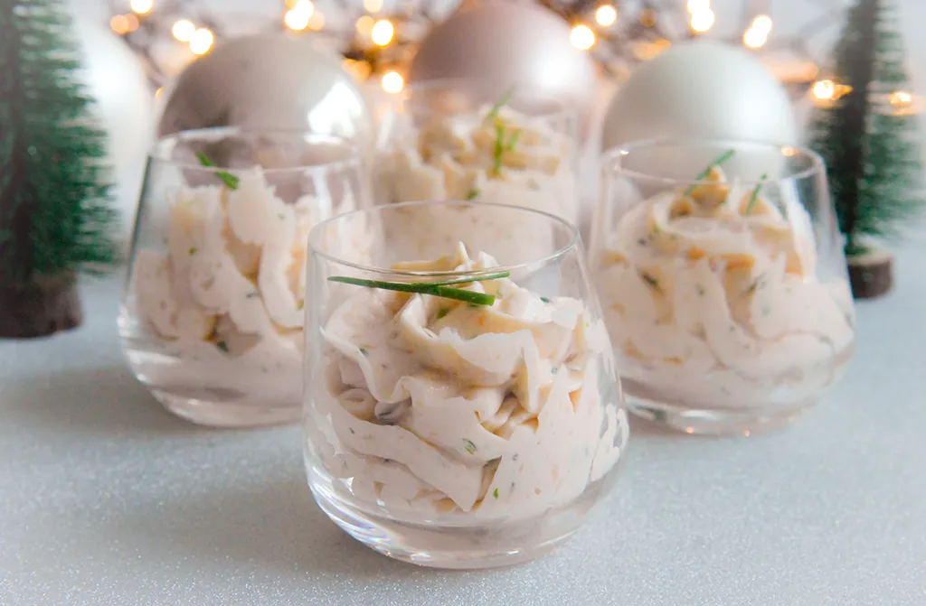 Serveer warm, eventueel in een vormpje voor een mooiere presentatie. Combineer beide mousses laagjesgewijs of apart op het bord.